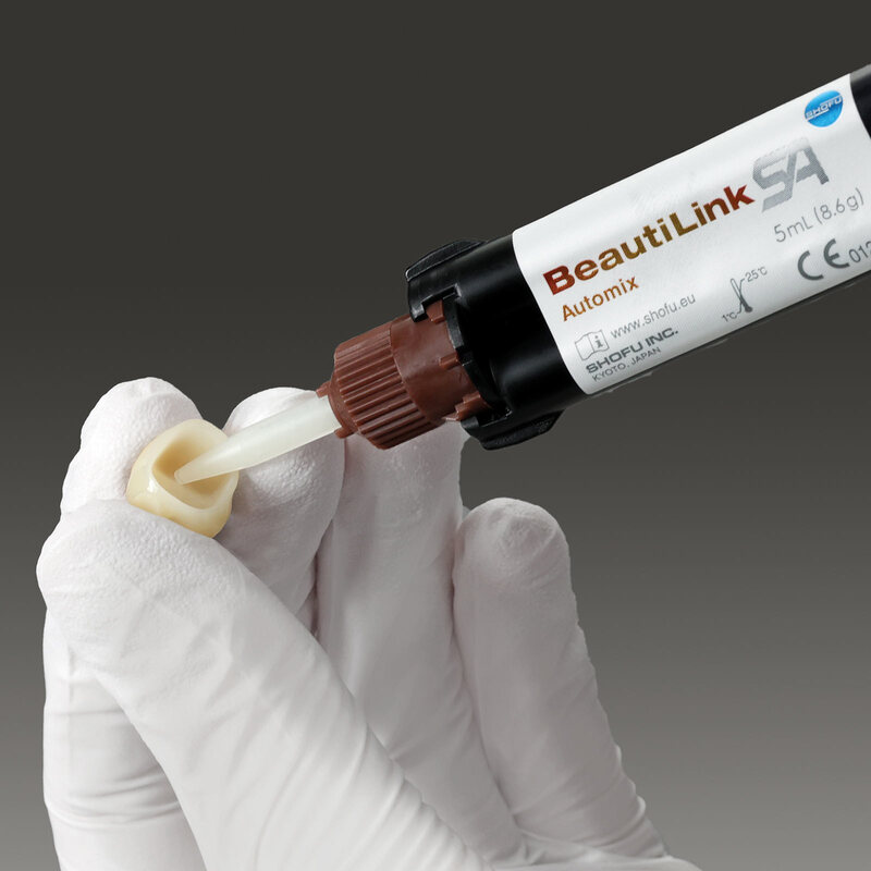 BeautiLink SA es un cemento de resina autoadhesivo de doble polimerización, diseñado específicamente para restauraciones de zirconia, el material estándar para las coronas actuales.