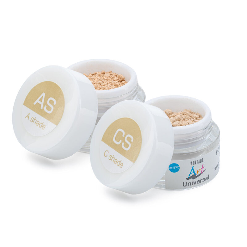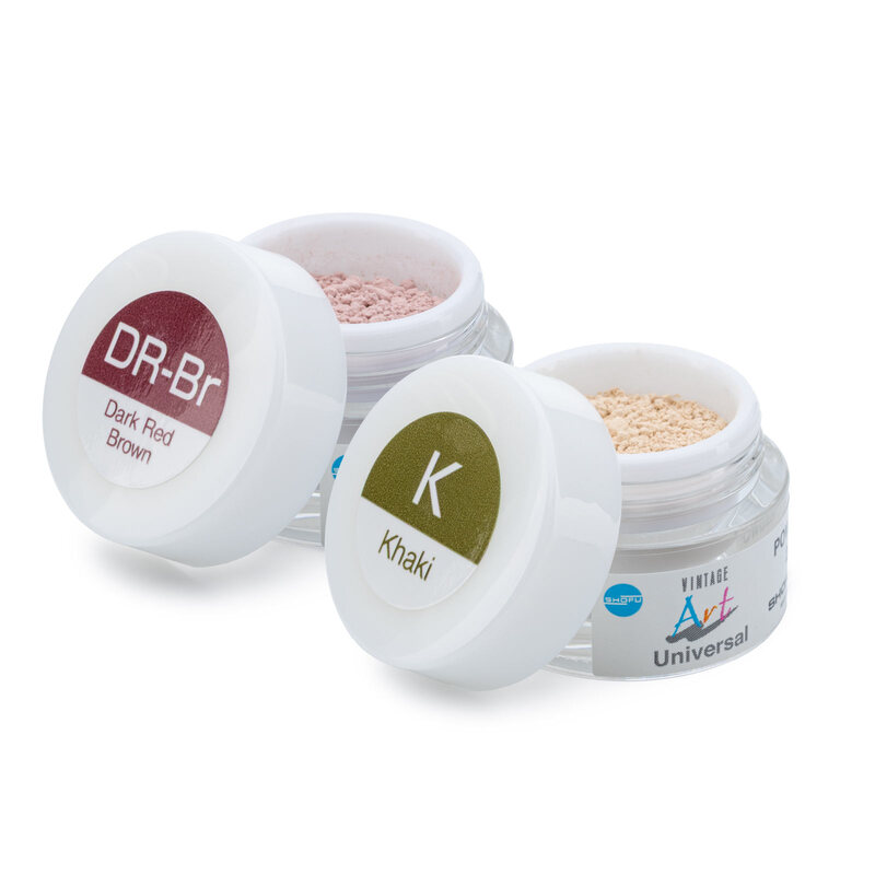 Con el Vintage Art Universal LIQUID normal, las masas también se pueden usar para el maquillaje y el glaseado clásicos de las restauraciones de cerámica estratificadas (técnica de maquillaje 2D). Dependiendo de la base, el usuario puede elegir entre un polvo de glaseado fluorescente o no fluorescente.